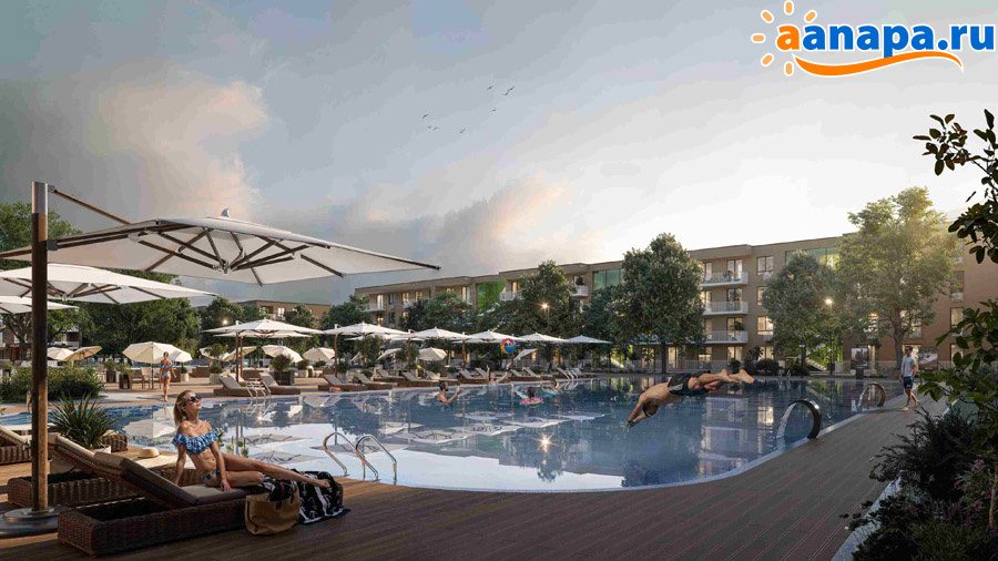 Жители комплекса смогут проводить жаркие летние дни в открытом каскадном бассейне. Вода, стекающая с каскадов, создает естественный расслабляющий шум. По периметру будут установлены скрытые колонки, которые можно будет использовать как для усиления релаксирующего эффекта, так и для проведения тренировок и мероприятий.